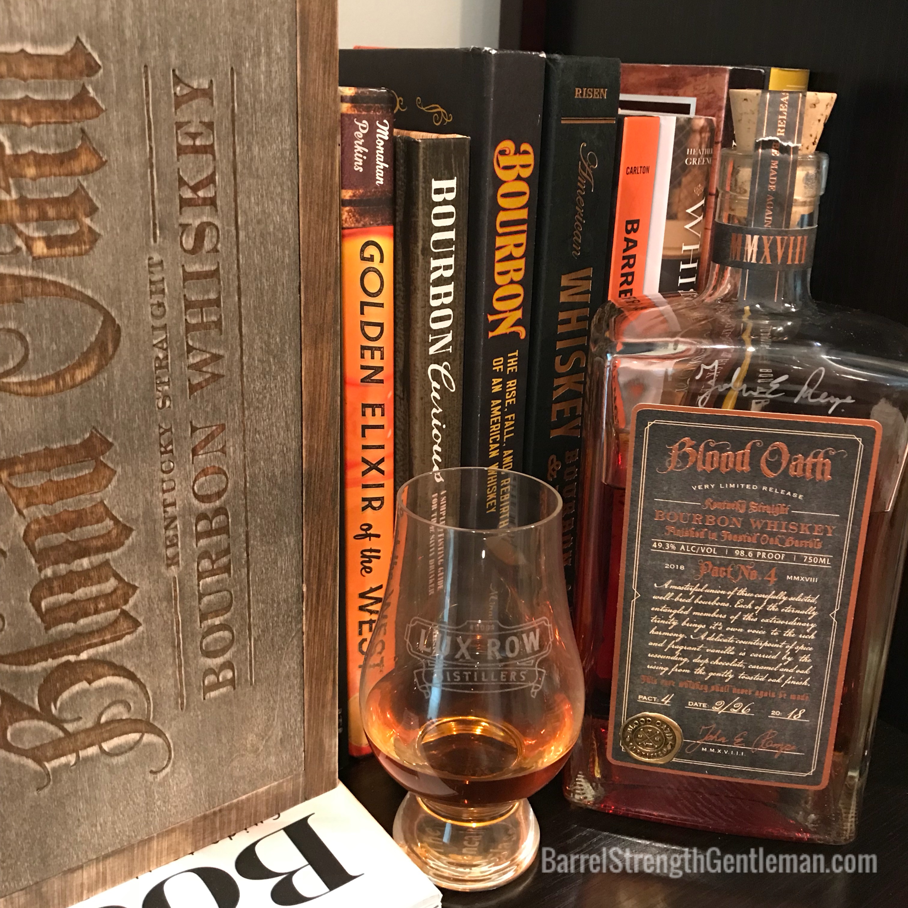 Blood Oath Pact No. 4 is a limited release with only 36,000 bottles produced, never to be made again. The distillery describes Blood Oath Pact No. 4 as “A masterful union of three well-bred bourbons, each bringing it’s own voice to the rich harmony found inside each bottle. The first, an extra-aged-12-year-old bourbon… The second, a rich 10-year-old bourbon… The third, a 9-year-old bourbon finished in toasted barrels.” The Blood Oath Series launched in 2015 with Pact No. 1, and will continue to highlight a different variant (Pact) each year. John E. Rempe is the creator of the Blood Oath Pact limited release series. He has been developing and blending spirits and beverages for over 20 years, joining Luxco 17 years ago. This release is sold in a commemorative dark-stained wooden box with a MSRP of $99.99. I bought this bottle at the new Lux Row distillery gift shop after a tour in July 2018. The bottle was signed by master blender John E. Rempe on the glass just above the label.