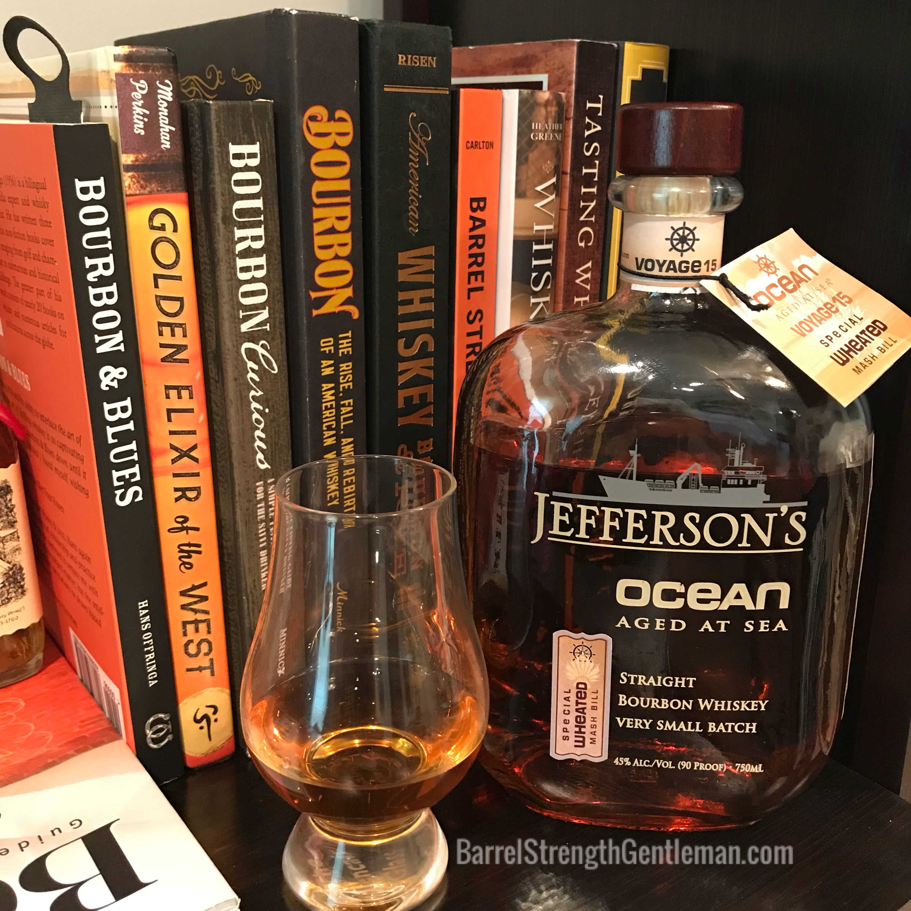 Jefferson’s Ocean started out as a experiment with 3 barrels on Trey Zoeller’s friend, Chris Fisher of OCEARCH’s ship, in an effort to find out what unique effects could be discovered by exposing the bourbon to the extreme elements experienced during a sea voyage. The barrels experience extreme temperature fluctuations, salty sea air and an almost constant gentle rocking of the ship. This resulted in a dark bourbon with a briny flavor. The experiment created such great demand from consumers, that Trey has since commercialized this experiment and sent hundreds of barrels around the world. Each voyage will typically cross the equator four times and visit five continents and over thirty ports. Ocean Voyage 15 is the first-ever “wheated” bourbon to be sent on one of these voyages. By using wheat instead of rye for its secondary grain, the maturation process allows more of the sweetness form the corn and vanilla from the wood to shine as opposed to the spiciness that is usually present from the rye. My bottle of Ocean Voyage 15 came from an exclusive bottling for Liquor Locker (Evansville, IN). It is bottle number 68 from batch number 126.
