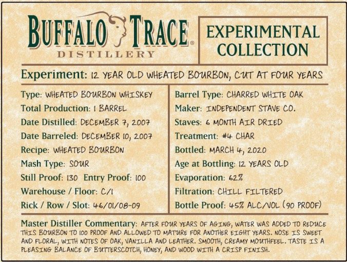 For the first experimental collection release for 2020: Wheated Bourbon Aged Four Years, Cut with Water, Aged Eight More Years. You can read the full press release from Buffalo Trace Distillery below.